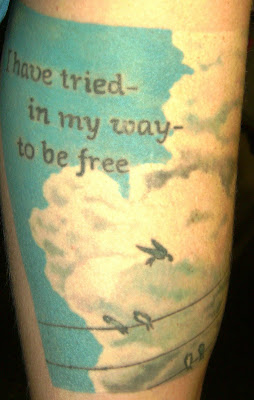There is a Leonard Cohen song called "Bird on the Wire" that I think is one of the most beautiful songs ever written. I feel the lyrics of the song so deeply and feel that they express such a core sense of who I am. Always, trying to be free. I aspire to someday be free instead of always trying and the tattoo is an attempt to remind myself that the feeling of trying is also a choice just as easy as the feeling of being free is a choice. The past tense nature of the words remind me to be light and free as a bird...